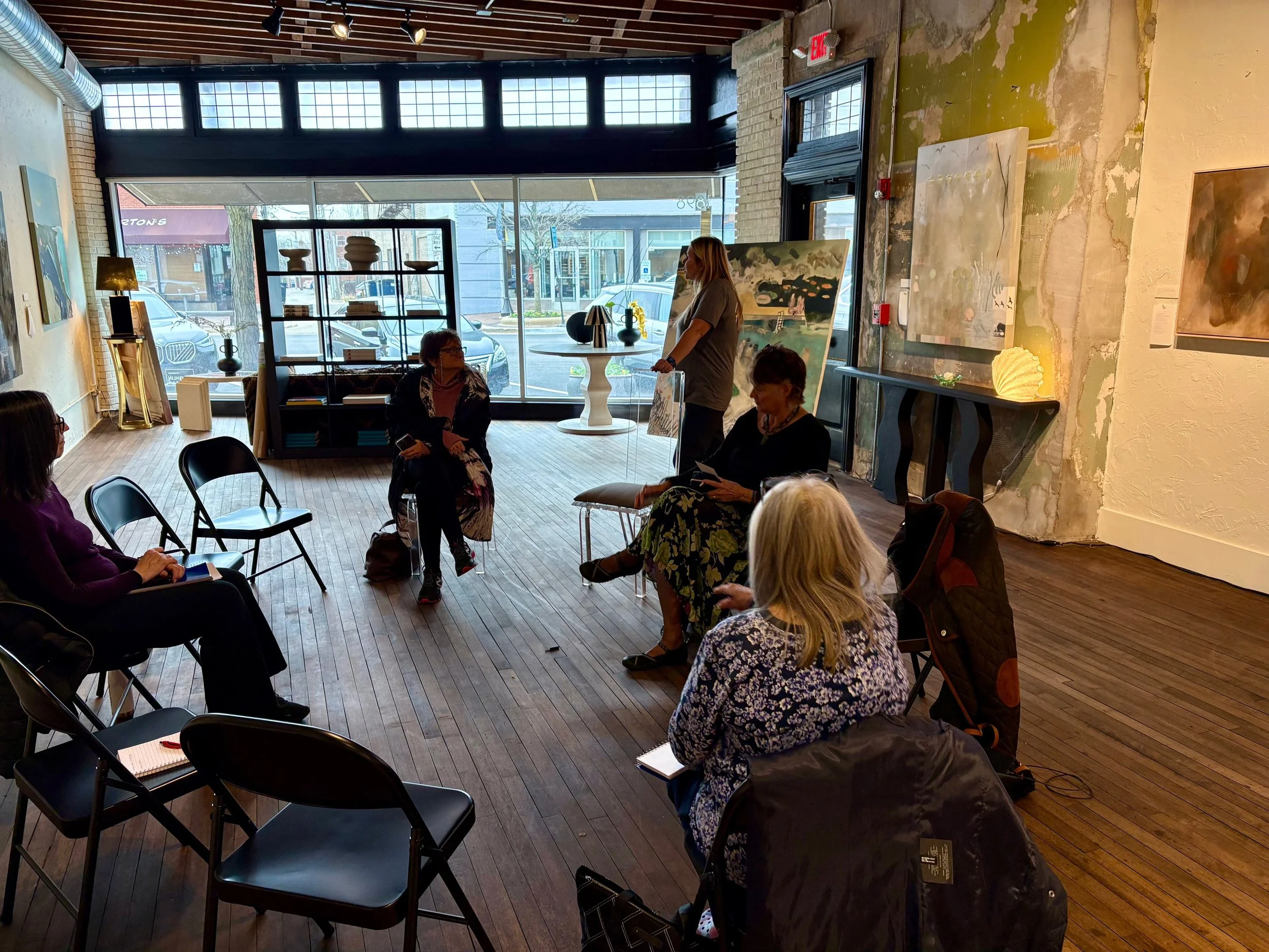 Thank you, Lauren Laughlin, curator of Laughlin Gallery, for an engaging afternoon of ekphrastic writing for our poets. The program included learning about the wide array of talent representing artists and their statements about their work. Lauren explained her launch into the world of art, and her passion for bringing quality work to the North Shore. In addition, more inspiration was provided in the Vault Creative next door, curated by proprietor Ellen Ozmun. Fascinating decorative items resulted in writing intrigue. Several writers chose the photograph entitled SoHo by photographer, Susan Wood, as a prompt eliciting a wide range of mood.